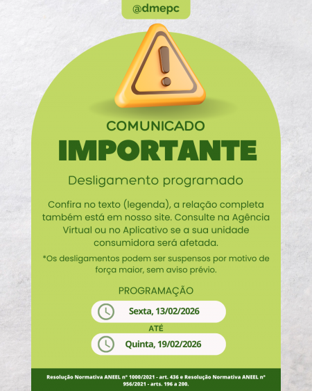 Acesse: Atendimento >> Agência Virtual >> Desligamentos Programados ou https://www2.dmepc.com.br/AgenciaVirtual/ServicosComplementares/DesligamentosProgramados