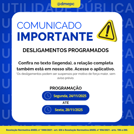 Acesse: Atendimento >> Agência Virtual >> Desligamentos Programados ou https://www2.dmepc.com.br/AgenciaVirtual/ServicosComplementares/DesligamentosProgramados
